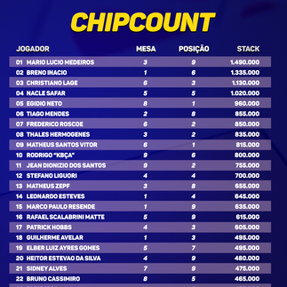 A segunda colocação ficou com Rodrigo Castro que passou com 800k de fichas. E o terceiro lugar ficou com Jean Dionizio, com 755k de fichas.